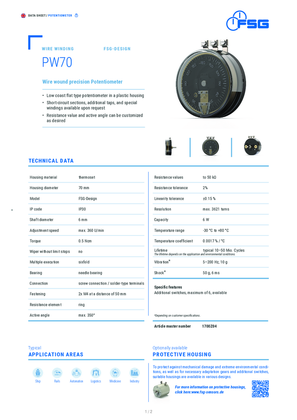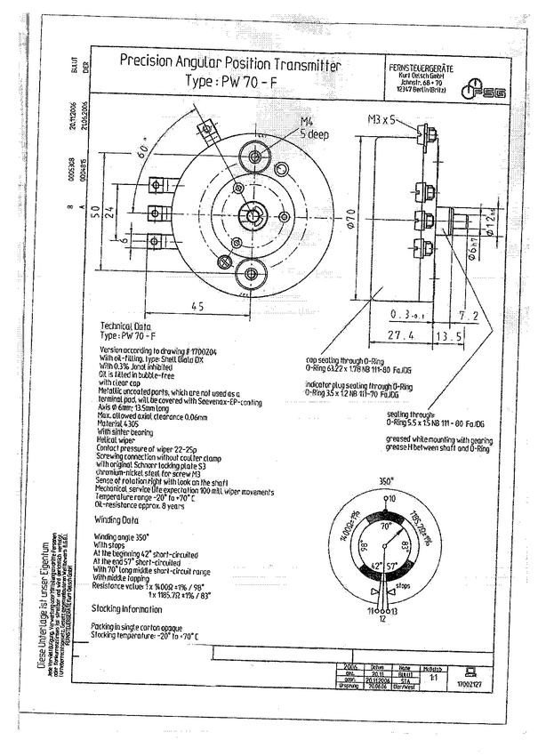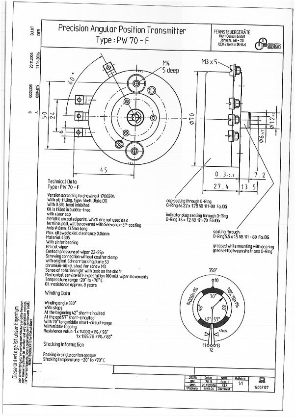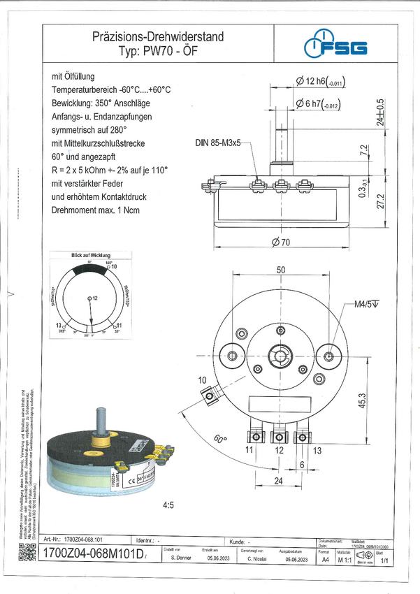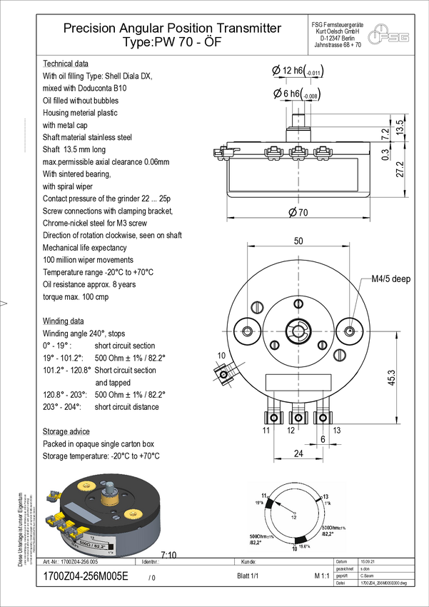 Precision Angular Position Transmitter PW70-ÖF-60/60 oil-filled temperature range -60°C....+60°C winding 350° stops beginning and end tappings symmetrical at 280° with middle short-circuit range 60° and tapped resistance 2 x 5 kom +- 2% / 110° each with feather and high contact pressure shaft 6 mm fi 24 mm long torque max. 100 cmp Zamiennik dla starego modelu 26166PW