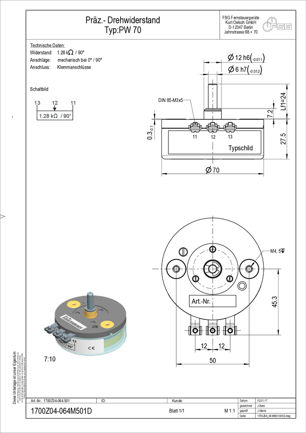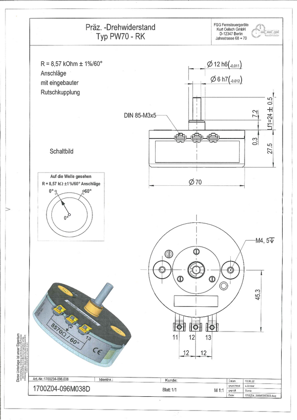 Potencjometr z modelu PW70/A/IP40-350-5K-1708Z03-096.008 i z takiego samego tylko IP65 zamiast IP40 PW70/A/IP65 350 5K 1708z03-352.078 ( z potencjometrem 1708z04-096.059) 1700Z04-096.059 Precision Potentiometer PW70-RK winding angle 350°, stops resistance 5 kU ± 1% / 350° shaft 6 mm Ý, LF 1 = 29 according to 0233 BPW-00:01 with incorporated slipping clutch cap with bore hole and cover i. e. cover according to 1700Z04-00:2602 and cover according to 1700Z04-00:2701 Uwaga: zdjęcie podobnego