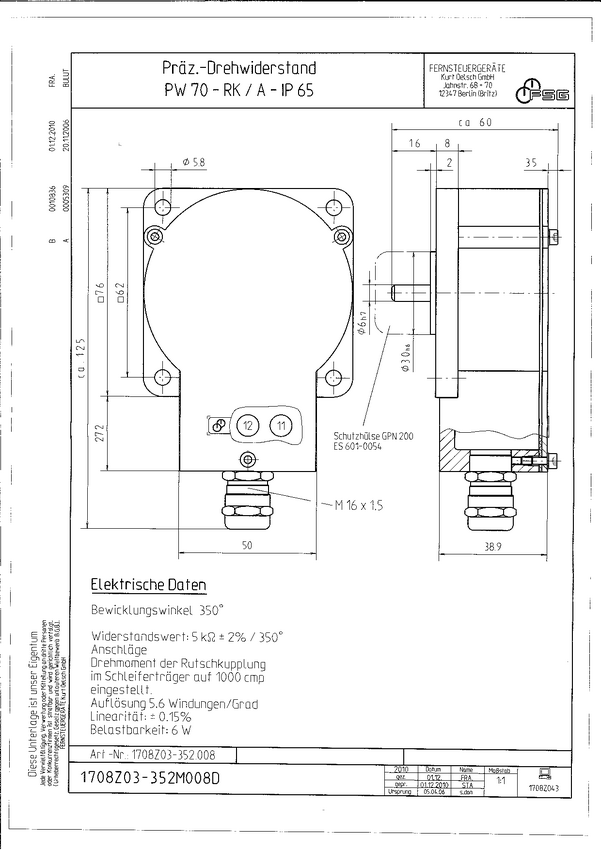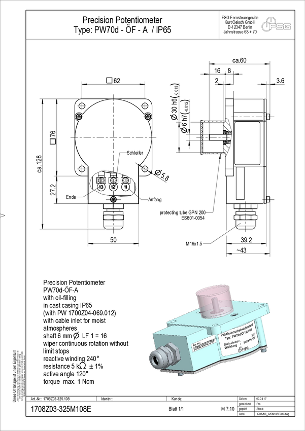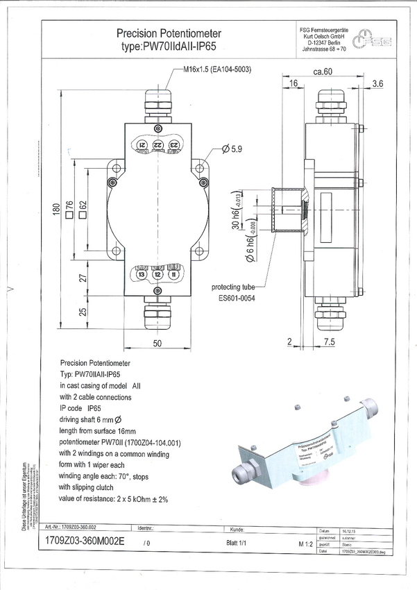 Precision Potentiometer Typ: PW70IIAII-IP65 1709Z03-360.002 in cast casing of model AII with 2 cable connections IP code IP65 driving shaft 6 mm Ý length from surface 16mm potentiometer PW70II (1700Z04-104.001) with 2 windings on a common winding form with 1 wiper each winding angle each: 70°, stops with slipping clutch value of resistance: 2 x 5 kU ± 2% tariff # 85 33 31 000 article weight: 0,550 KG