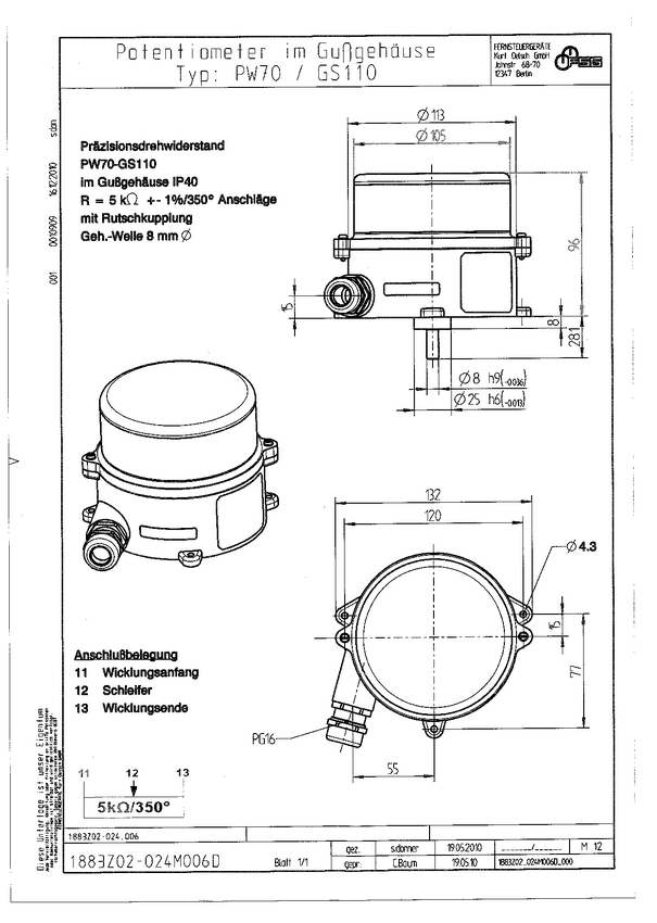 Precision Potentiometer in Cast Iron IP40 Case - 5k Ohms 350 deg stops 1708Z03-096.079 (1708Z03-096.079 + PW 1700Z04-096.064 PW70A Precision Potentiometer in cast iron case to IP40 1708Z03-096.079 (with PW 1700Z04-096.064). Potentiometer is 5K Ohms +/-1% 350o Stops. 125mm x 76mm x 39mm overall. (excluding shaft) 16 mm long from support of A-casing with slipping clutch according to dimensional sketch1708Z03-096M079D Scope of delivery without setting key. Fixing flange has 4 x 6mm dia smooth holes on 62 x 62m