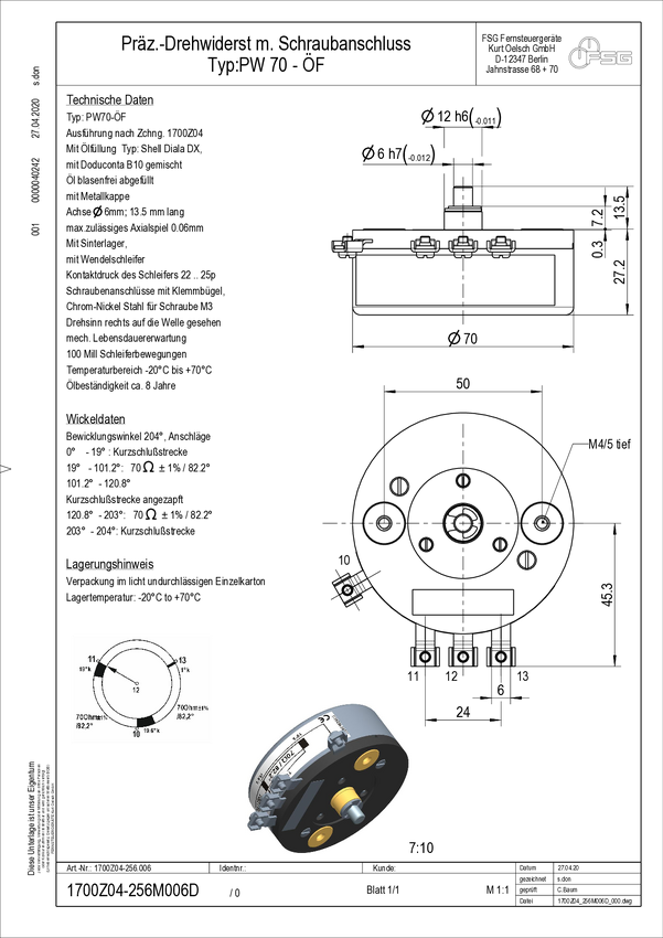 PW70 500 ohm + 500 Ohm Precision Potentiometer PW70-ÖF with oilfilling, with metal cap winding angle 204° stops 0° - 19°: short circuit section 19° -101,2°: 500 ohm +/- 1% /82,2° 101,2°-120,8°: shorted & tapped 120,8°-203°: 500 Ohm +/- 1% /82,2° 203°-204°: shorted shaft 6 mm O 13,5mm long from support sense of rotation: right (view from shaftside) torque: max. 100 cmp with sintered bearing tariff # 85 33 31 00