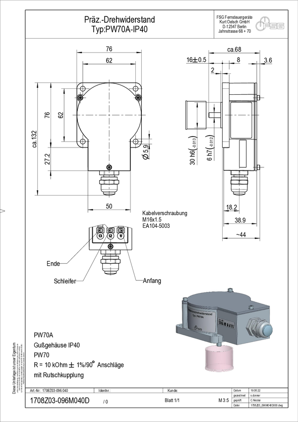 Precision Angular Position Transmitter PW70A in cast casing IP65 accord. to 1708Z03-352M008D (with PW 1700Z04-096.011) R = 5 kU +- 1%/350° stops length from support 16 mm shaft 6 mm Ý, with slipping clutch w środku potencjometr: Precision Angular position transmitter PW70 res. 5k ohm+-1% 1700z04-096.011 PW70-ST-SC-5K