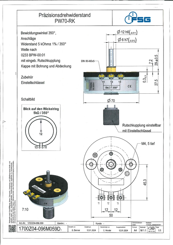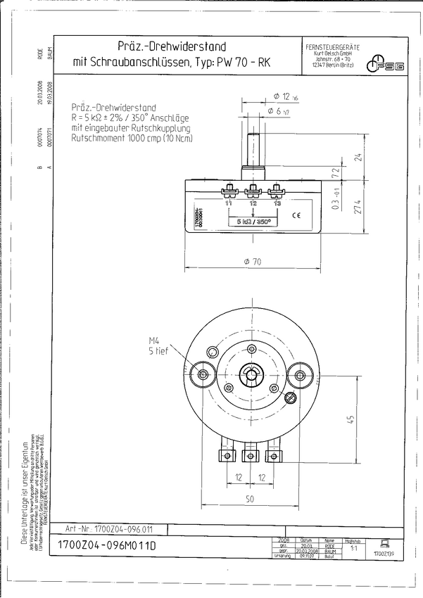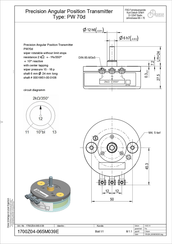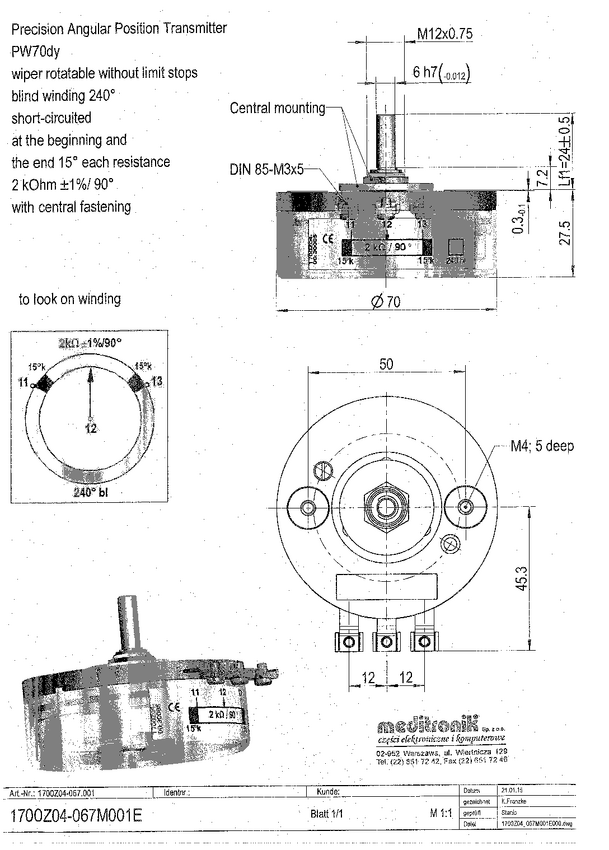 Precision Angular position transmitter PW70 res. 5k ohm+-2% ( dawniej +-1%) 350 deg/ stops shaft 6mm 24 mm long from support shaft #0001W01-00:0108; with slipping cloutch 1700z04-096.011 PW70-RK Precision Potentiometer PW70-RK resistance 5 kU +- 2%/350° stops shaft 6 mm Ý, 24 mm long from support shaft # 0001W01-0R:0108 with added slipping clutch version accord. to 1700Z04-096M011D Pasuje do obudowy PW70/A/IP65 350 5K+-1% / 350 AN1708Z03-352.008