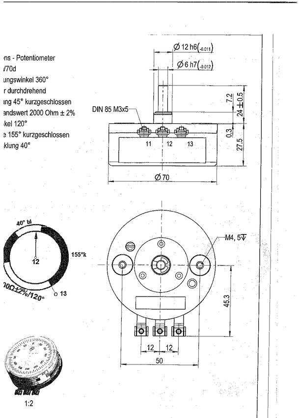 Precision Angular Position Transmitter PW70-F Kąt pracy mechaniczny 350 stopni ze stopami, Kąt pracy elektryczny: 42 stopnie shorted; 98 stopni 1400 ohm +-1%; 70 stopni shorted; 83 stopnie 1185,7 ohm +-1%; 57 stopnie shorted; Potencjometr 4 końcówkowy z Center Tapem ośka 6 nn 13,5 mm długa; średnica korpusu 70mm; gł. 27,4mm; od frontu M4 rozstaw 50mm Dla wersji standard Tolerancja rezystancji 2%; Liniowość standard +-0,15% moc 6W; wersja specjalna może mieć inne parametry łożysko sintered bearning