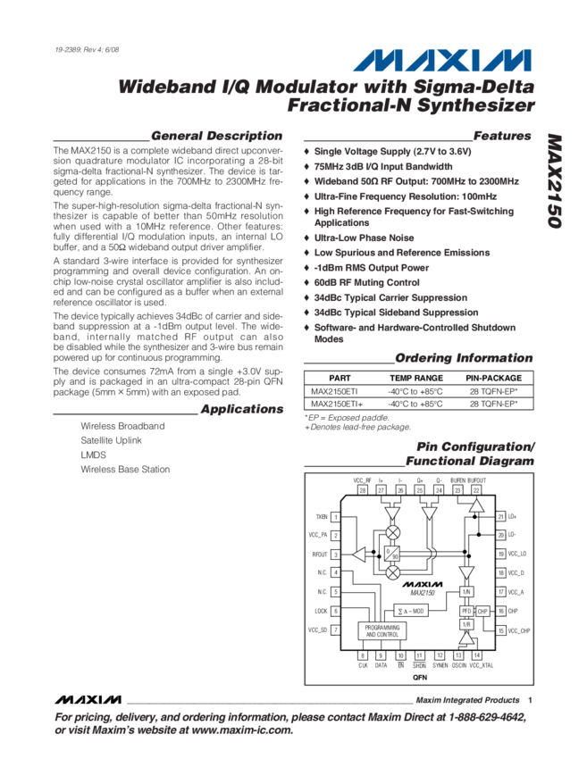 MAX2150 3.0 Volt Wideband I/Q Modulator with Sigma-Delta Franctional-N Synthesizer