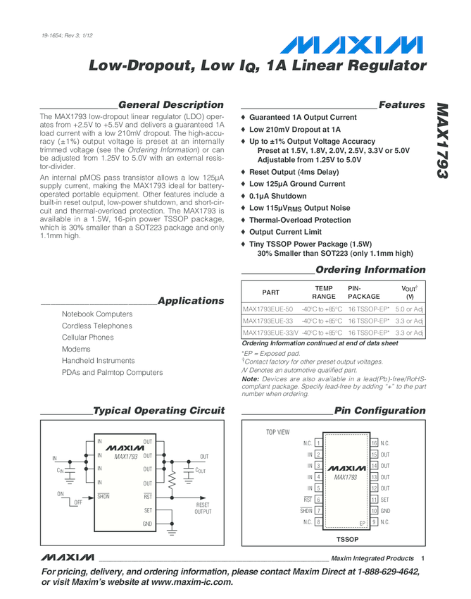 MAX1793 Low-Dropout, Low I<sub>Q, 1A Linear Regulator