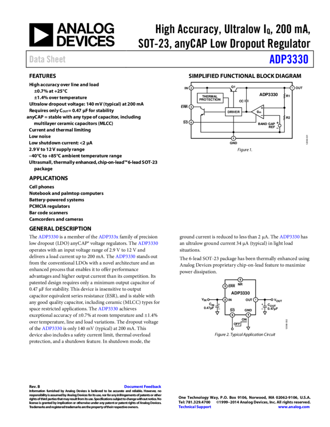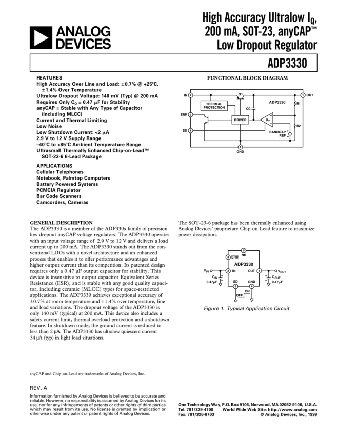 ADP3330: High Accuracy Ultralow I(Q), 200 A, SOT-23, anyCAP® Low Dropout Regulator