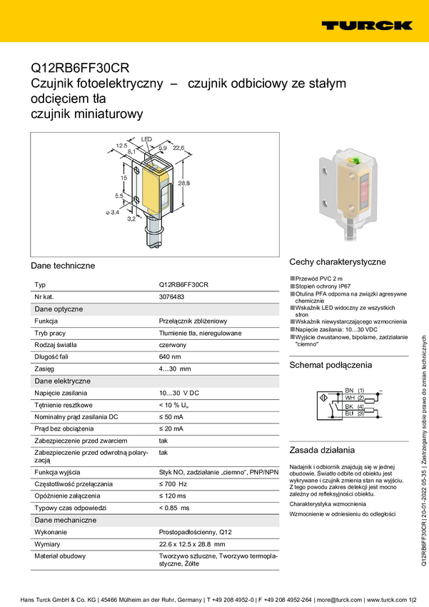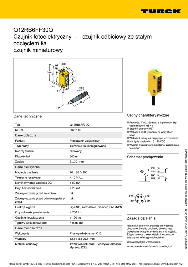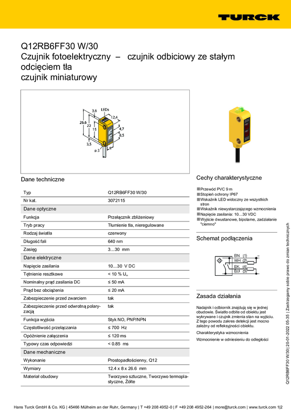 Czujnik dyfuzyjny Turck Q12RB6FF30 W/30 3072115 1 szt.