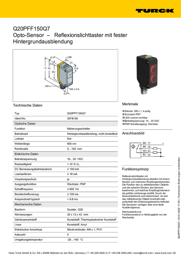 Czujnik dyfuzyjny Turck Q20PFF150Q 3078221 1 szt.