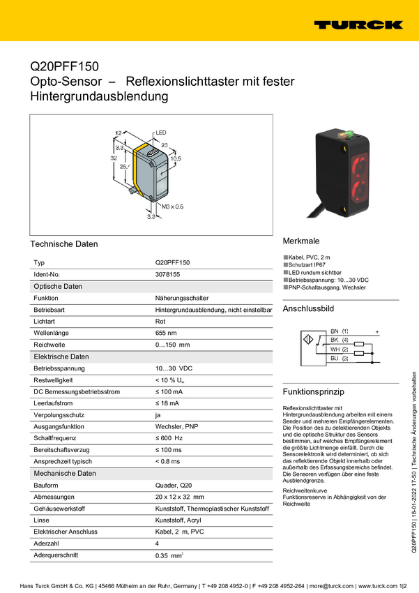 Czujnik dyfuzyjny Turck Q20PFF150 3078155 1 szt.