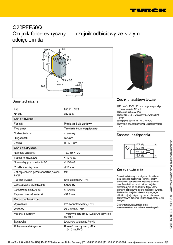 Czujnik dyfuzyjny Turck Q20PFF50 3077769 1 szt.