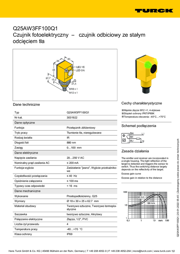 Czujnik dyfuzyjny Turck Q25AW3FF100 3031918 przełączanie światła 1 szt.