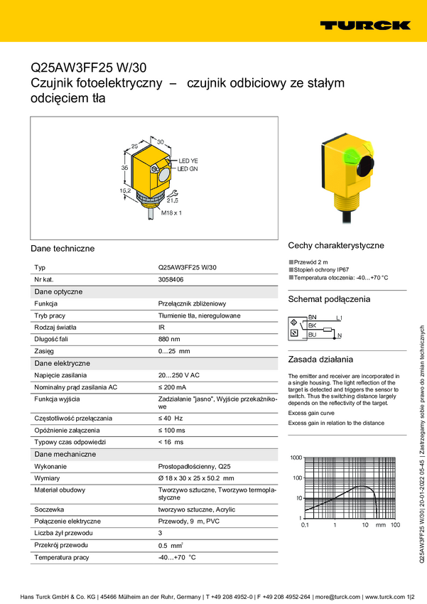 Czujnik dyfuzyjny Turck Q25AW3FF25 W/30 3058406 przełączanie światła 1 szt.