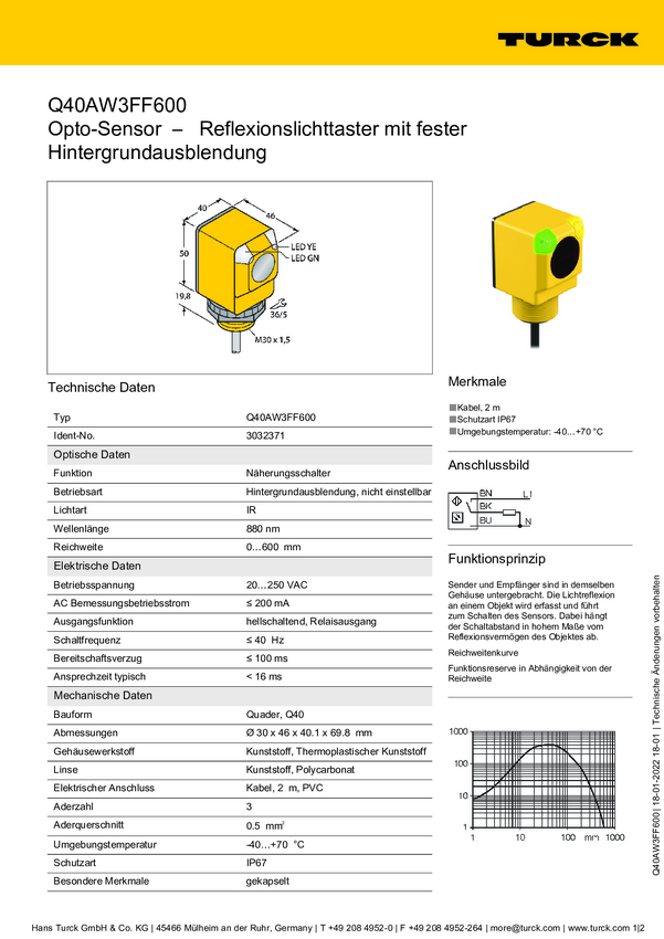 Czujnik dyfuzyjny Turck Q40AW3FF600 W/30 3033909 przełączanie światła 1 szt.