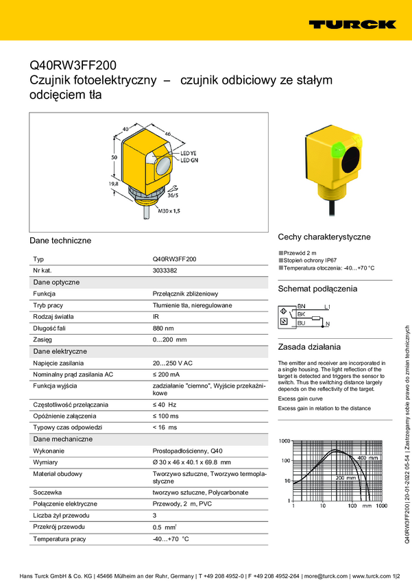 Czujnik dyfuzyjny Turck Q40RW3FF200 W/30 3033953 przełączanie w ciemności 1 szt.