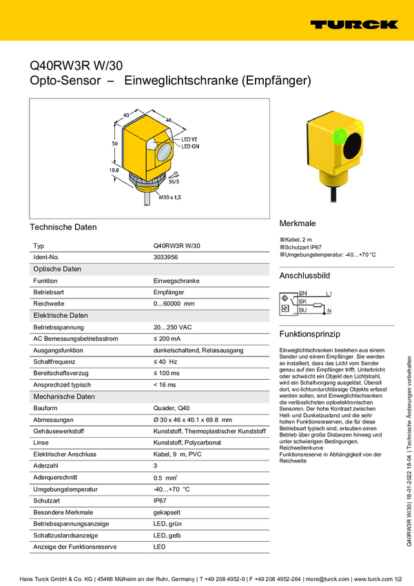 Bezzwrotny czujnik fotoelektryczny Turck Q40RW3R W/30 3033956 przełączanie w ciemności 1 szt.