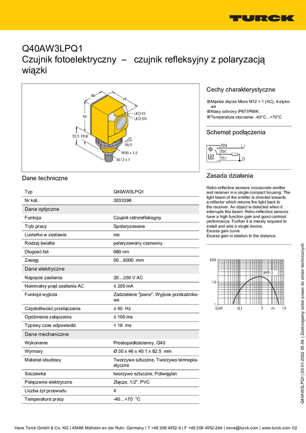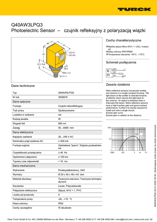 Fotokomórka odbiciowa Turck Q40AW3LPQ3 3036979 1 szt.