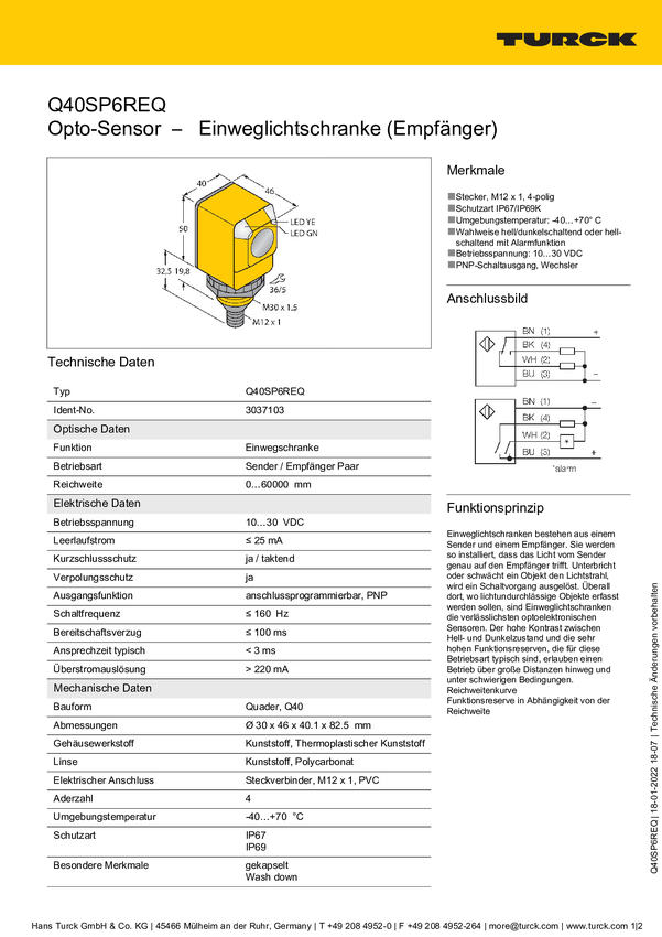 Bezzwrotny czujnik fotoelektryczny Turck Q40SP6REQ 3037103 1 szt.