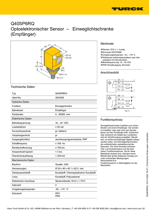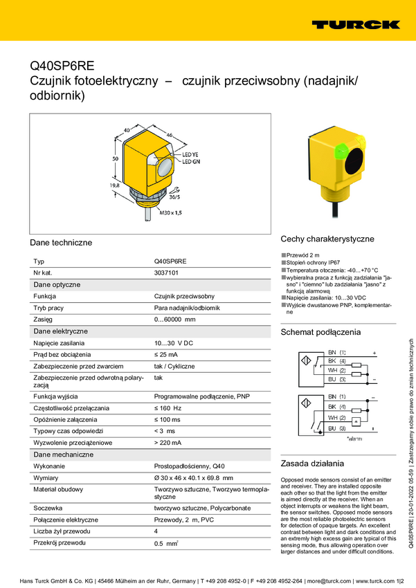 Bezzwrotny czujnik fotoelektryczny Turck Q40SP6R 3032373 1 szt.