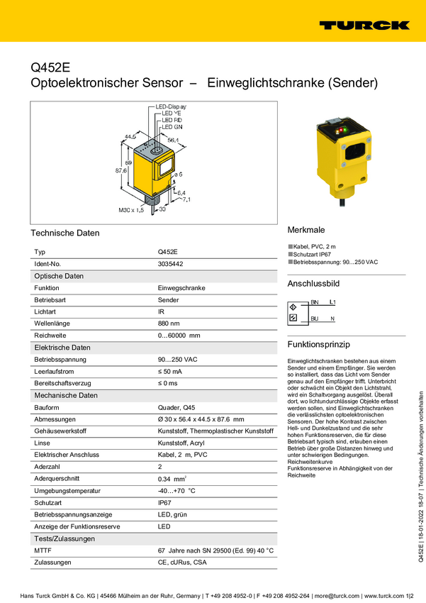 Bezzwrotny czujnik fotoelektryczny Turck Q452E 3035442 1 szt.
