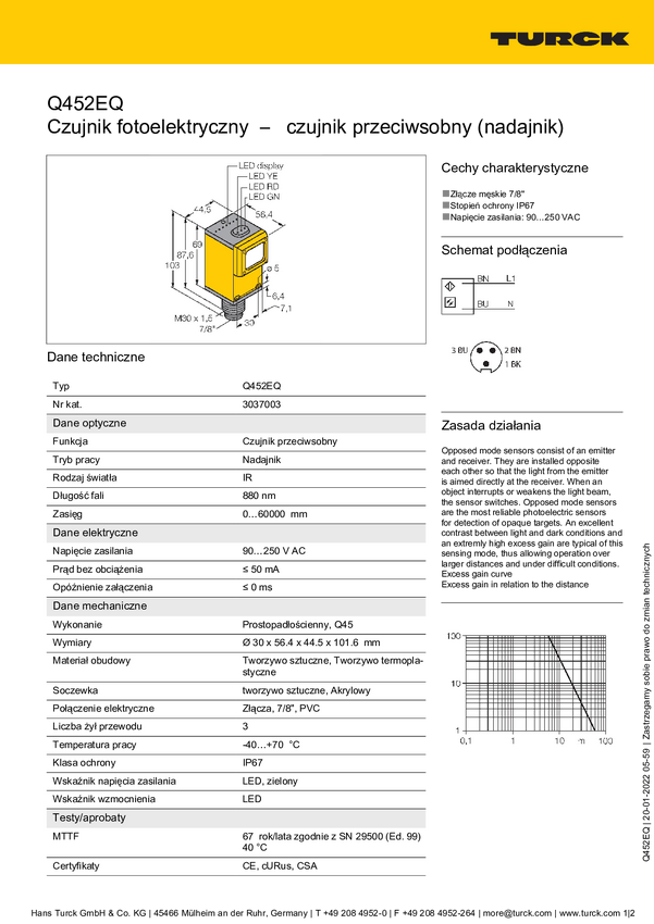 Bezzwrotny czujnik fotoelektryczny Turck Q452EQ1 3040222 1 szt.