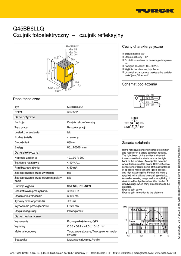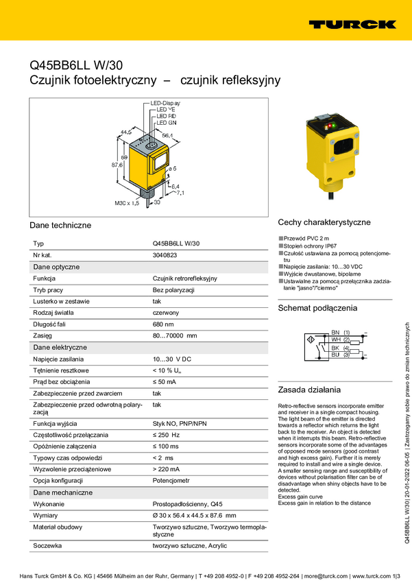 Fotokomórka odbiciowa Turck Q45BB6LLP W/30 3040824 1 szt.