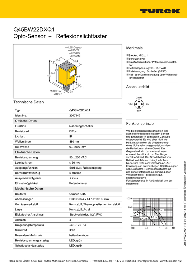 Czujnik dyfuzyjny Turck Q45BW22DXQ1 3047142 1 szt.