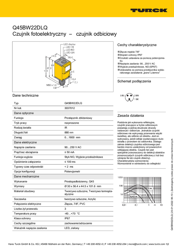 Czujnik dyfuzyjny Turck Q45BW22DQ1 3040213 1 szt.