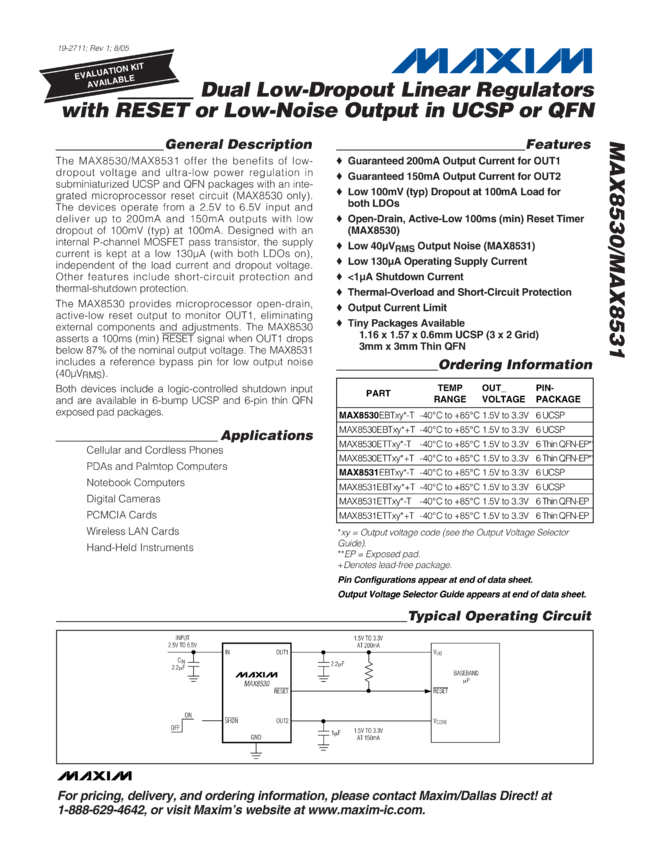MAX8530, MAX8531 Dual Low-Dropout Linear Regulator with Reset or Low-Noise Output in UCSP or QFN