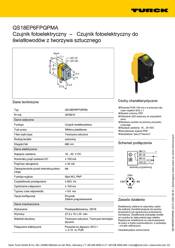 Czujnik światłowodowy Turck QS18EN6FPQ 3075724, 1 szt.