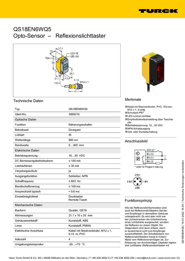Czujnik dyfuzyjny Turck QS18EN6WQ5 3069215 1 szt.