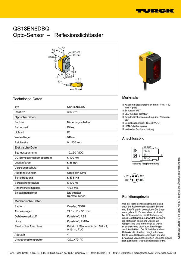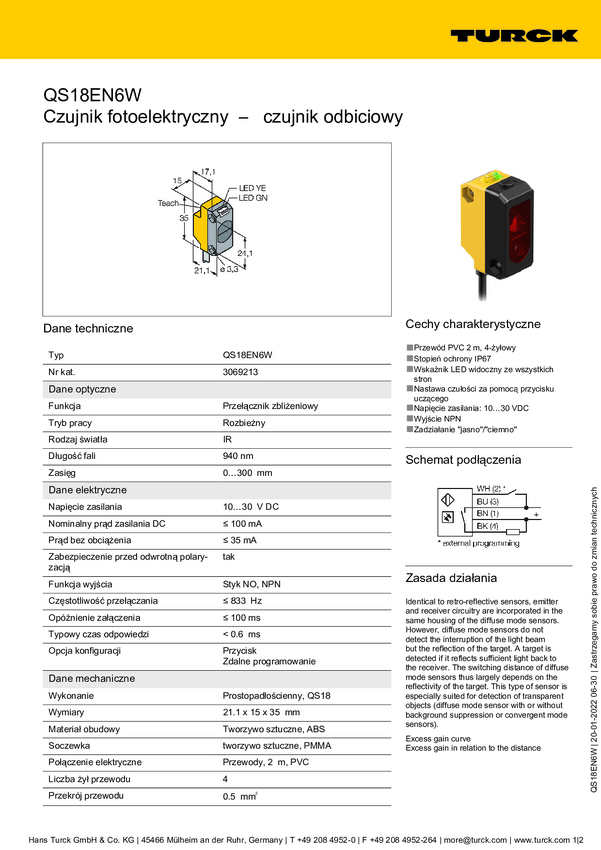 Czujnik dyfuzyjny Turck QS18EN6WQ 3069214 1 szt.
