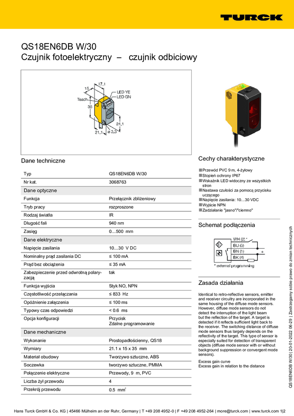 Czujnik dyfuzyjny Turck QS18EN6DB W/30 3068763 1 szt.