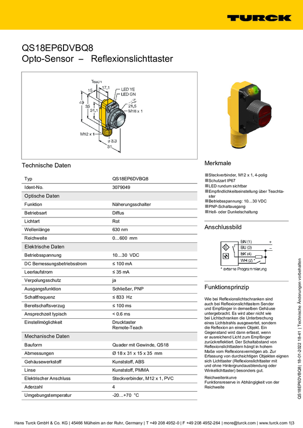 Czujnik dyfuzyjny Turck QS18EP6DVBQ8 3079049 1 szt.