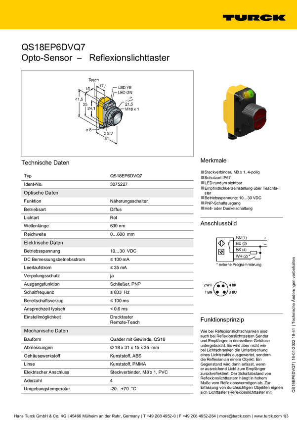 Czujnik dyfuzyjny Turck QS18EP6DVQ7 3075227 1 szt.