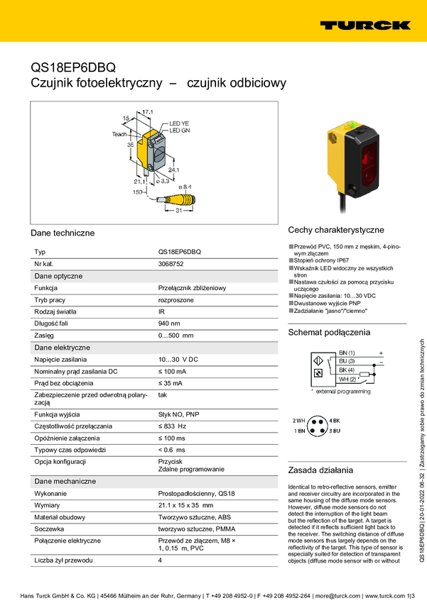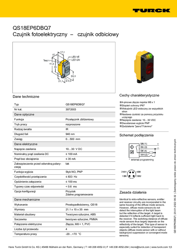 Czujnik dyfuzyjny Turck QS18EP6DBQ7 3072003 1 szt.