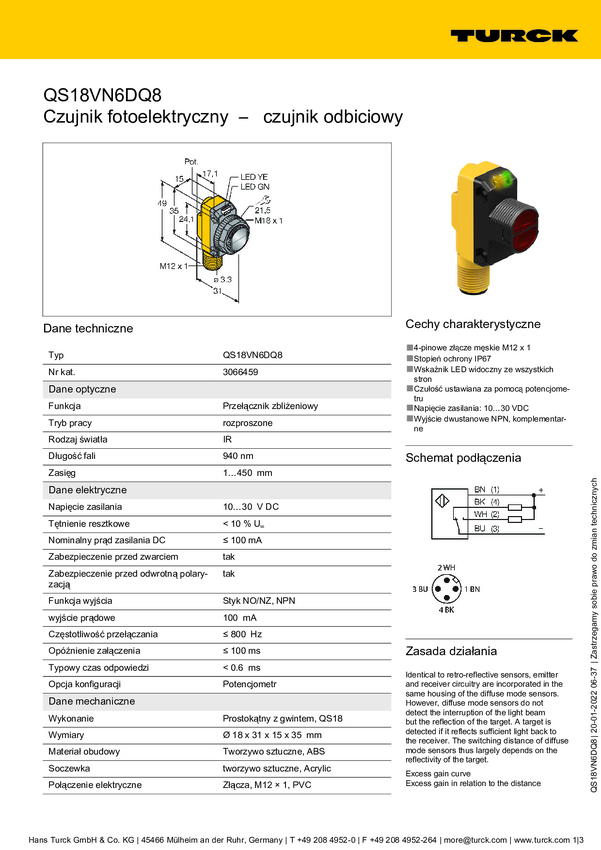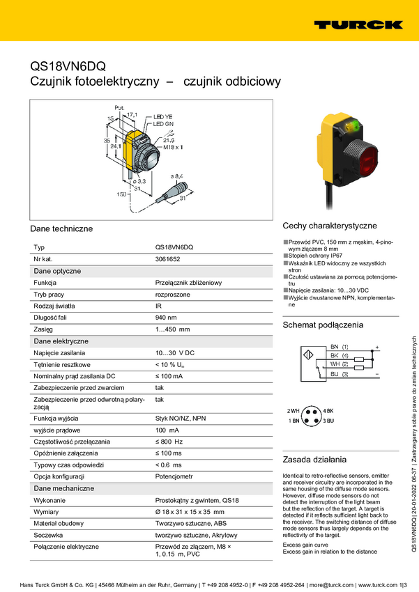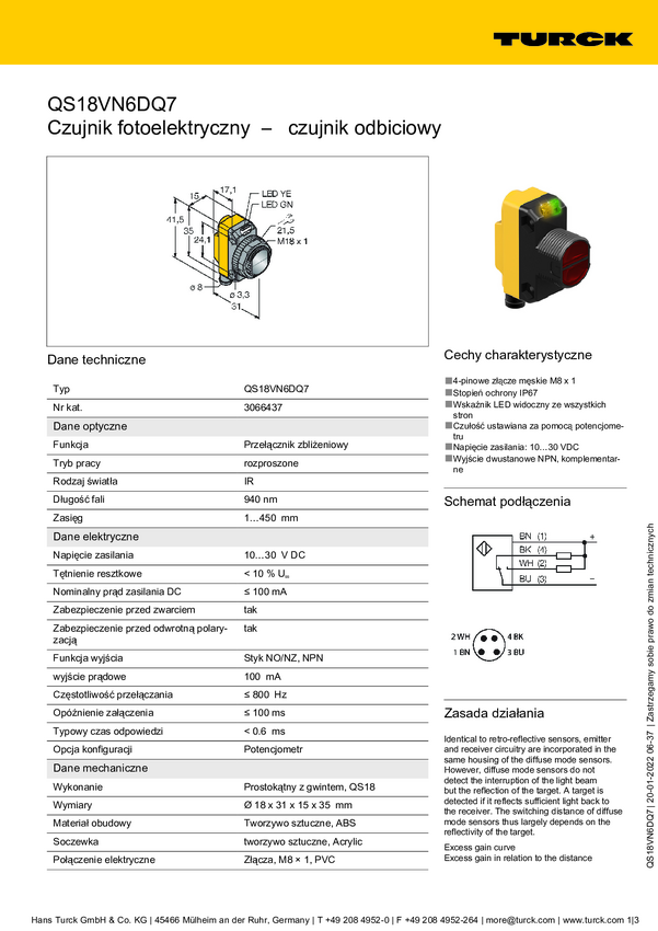 Czujnik dyfuzyjny Turck QS18VN6DBQ7 3066443 1 szt.