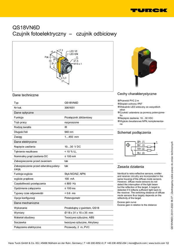 Czujnik dyfuzyjny Turck QS18VN6D 3061651 1 szt.