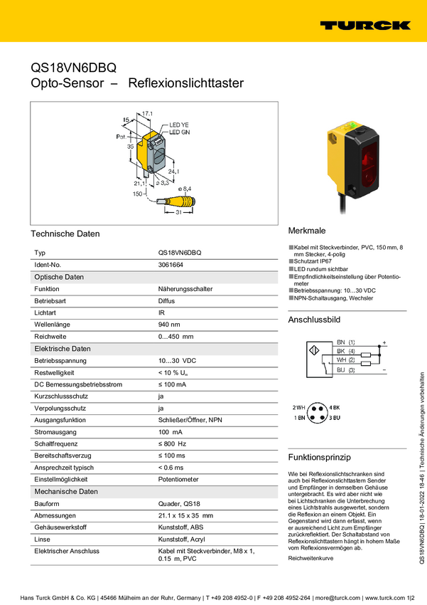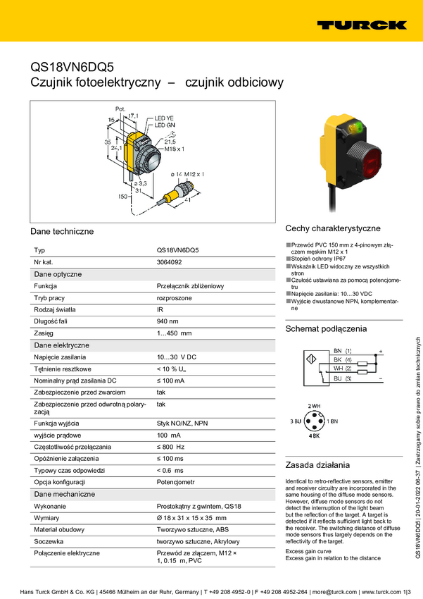 Czujnik dyfuzyjny Turck QS18VN6DBQ5 3064594 1 szt.