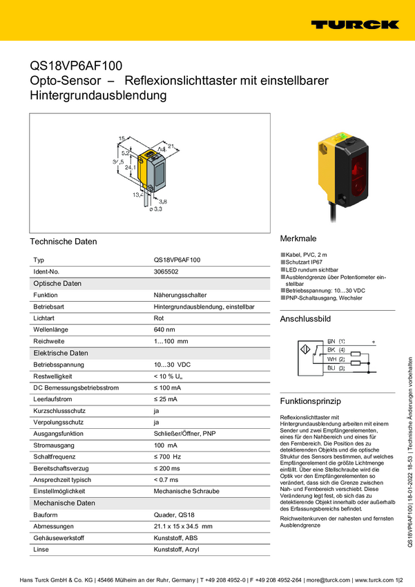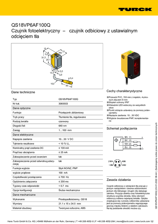 Czujnik dyfuzyjny Turck QS18VP6AF100Q 3065503 1 szt.