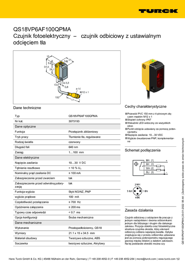 Czujnik dyfuzyjny Turck QS18VP6AF100QPMA 3075193 1 szt.