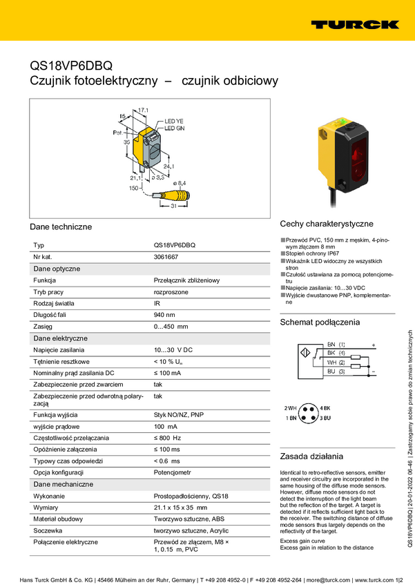 Czujnik dyfuzyjny Turck QS18VP6DBQ8 3066466 1 szt.