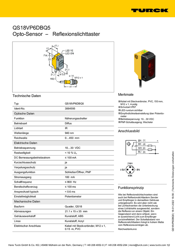 Czujnik dyfuzyjny Turck QS18VP6DBQ5 3064595 1 szt.