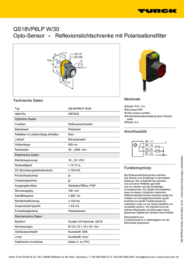 Fotokomórka odbiciowa Turck QS18VP6LP W/30 3061632 1 szt.