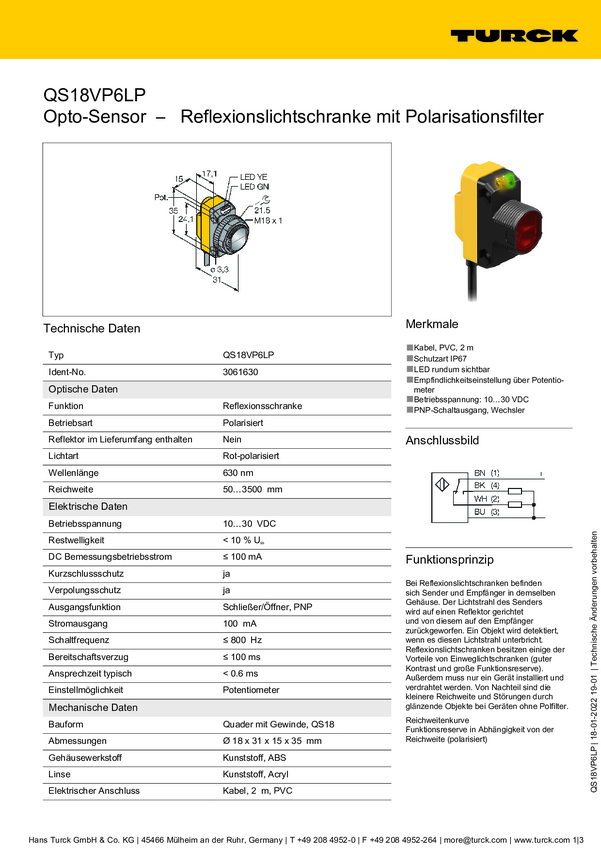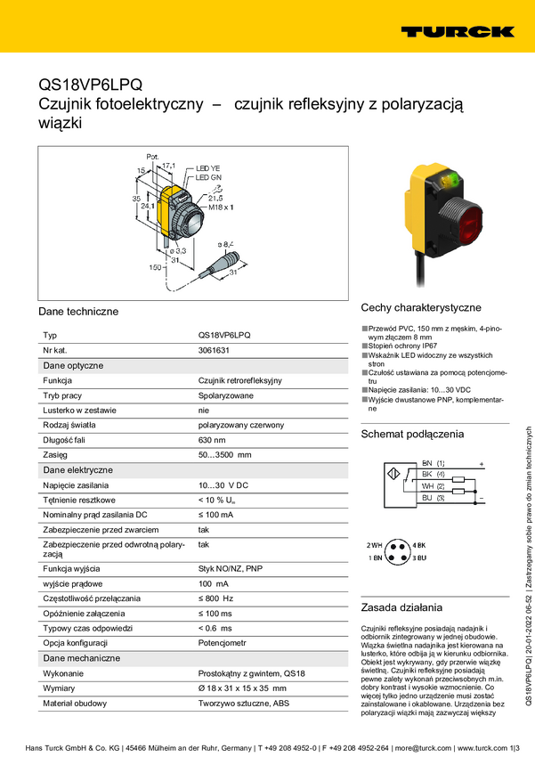 Fotokomórka odbiciowa Turck QS18VP6LPQPMA 3075201 1 szt.