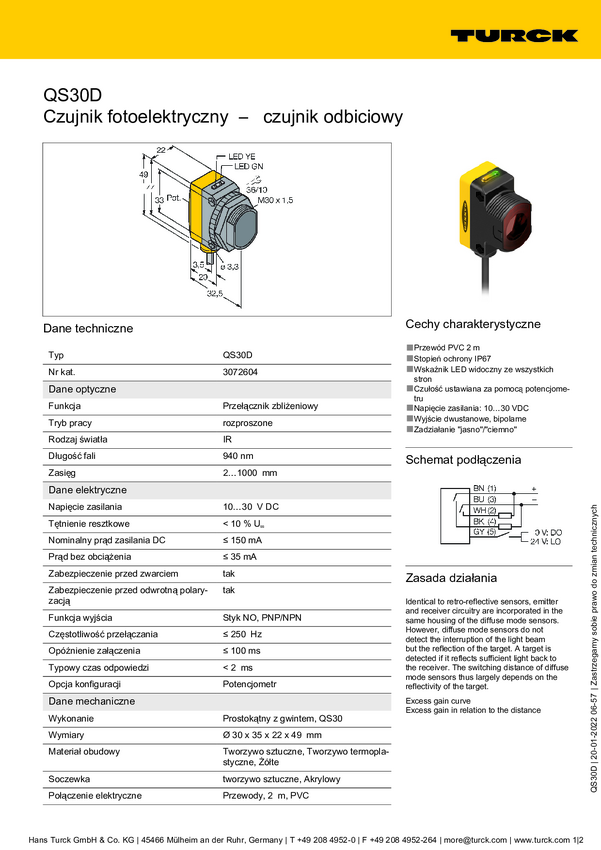 Czujnik dyfuzyjny Turck QS30D 3072604 1 szt.