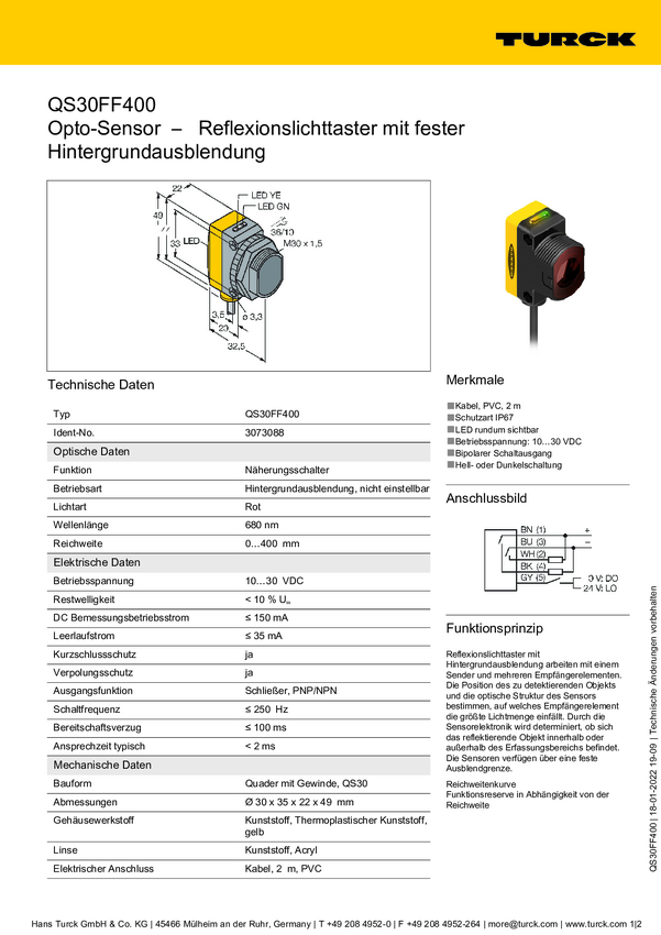 Czujnik dyfuzyjny Turck QS30FF400 W/30 3073206 1 szt.