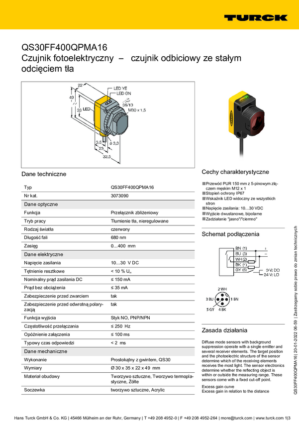 Czujnik dyfuzyjny Turck QS30FF400QPMA16 3073090 1 szt.