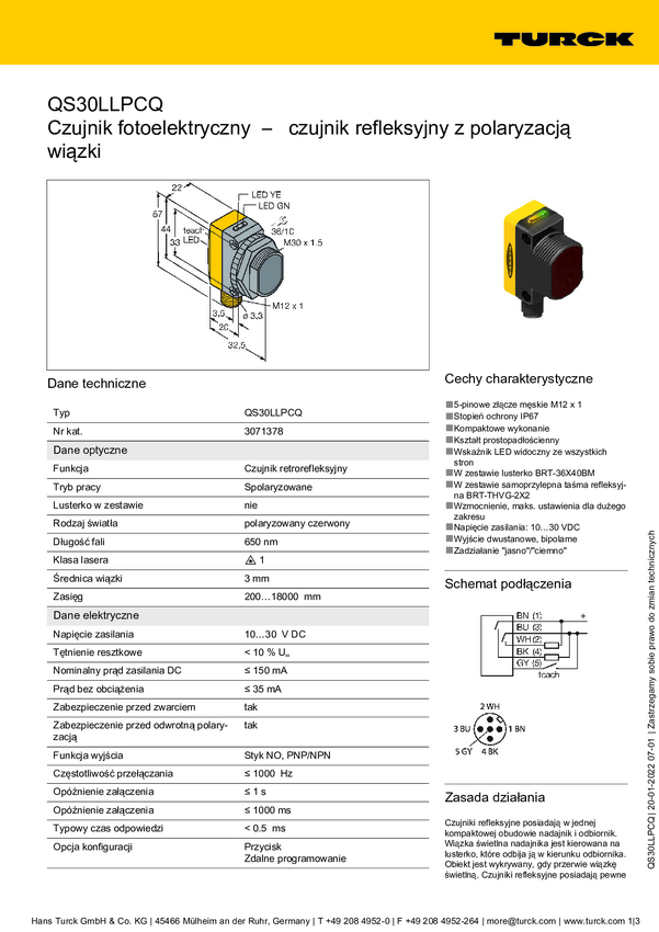 Fotokomórka odbiciowa Turck QS30LLPC W/30 3071379 1 szt.