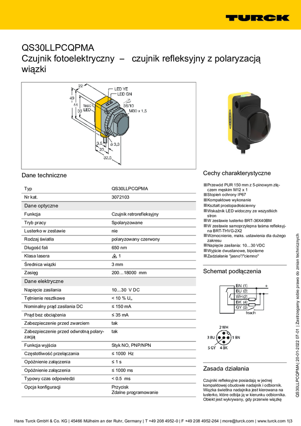 Fotokomórka odbiciowa Turck QS30LLPCQPMA 3072103 1 szt.